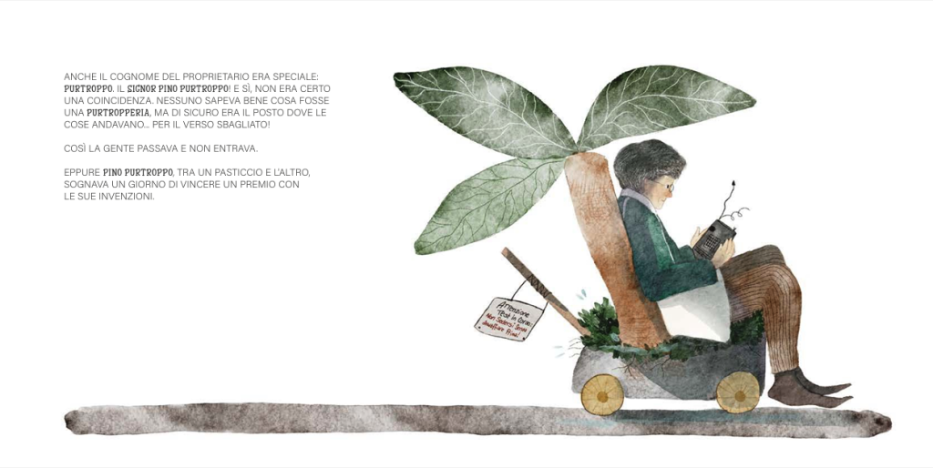 L’idea della Purtropperia è nata in un periodo in cui collezionavo parecchi ‘purtroppo’: tentativi andati storti, errori, aspettative mancate. A un certo punto erano diventati così tanti che ho pensato di aprire un negozio e venderli, invece di continuare a nasconderli. Disegnando e scrivendo, ho capito che proprio lì si apriva una possibilità narrativa e poetica: guardare ciò che non funziona come dovrebbe e scoprire che può funzionare in un altro modo. Ricordo ancora il momento in cui è comparso Pino Purtroppo: da lì l’albo ha trovato la sua voce, ironica e tenera, e io ho capito che stavo raccontando una storia che parlava anche a me. Da quel momento, lavorare alla Purtropperia è diventato un gesto di cura e di divertimento.